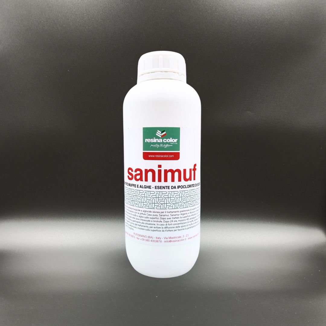 SANIMUF è una soluzione bonificante ad alta concentrazione indicata per la pulizia e la disinfezione di pareti e rivestimenti interni ed esterni che possono essere contaminati da microrganismi. Per le sue particolari caratteristiche SANIMUF è consigliata nel trattamento di tutte le superfici in muratura (intonaci grezzi, intonaci pitturati, cemento a vista, eternit, ecc.) che si presentano infestate da muffe come locali ad elevato tasso di umidità e pareti esposte a nord.